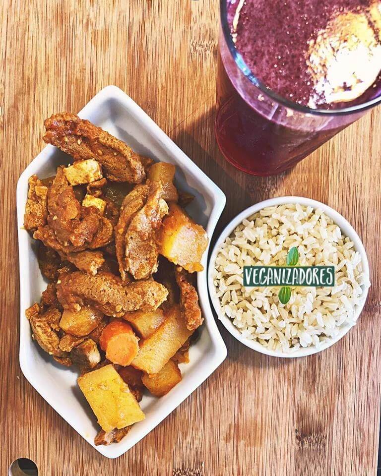 Hidratar as fatias de soja por 10 min em água fervente. Cortar as batatas e cenouras em tamanho médio (que caiba em uma garfada). Refogar o alho e a cebola no óleo de coco até que a cebola fique translúcida. Adicionar a proteína de soja e refogar até que comece a dourar. Acrescentar o shoyu, molho de tomate, mostarda e mexer até homogeneizar. Colocar as batatas, cenouras, nutritional yeast e o tempero e cozinhar por cerca de 20 minutos com a panela tampada.